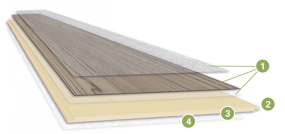 1. Deckelement: PU-Deckschicht mit NatureSurface, Dekor und Stabilisierung